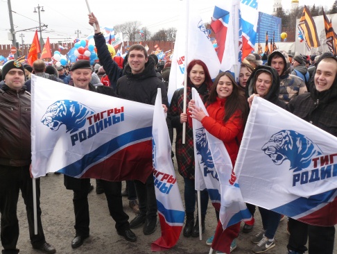 18 марта 2016 года в Москве на Васильевском спуске у самых стен Кремля молодёжное крыло партии "РОДИНА" - движение "ТИГРЫ РОДИНЫ" в одном строю со своими старшими товарищами по партии приняло участие в праздновании Дня воссоединения Крыма с Россией.