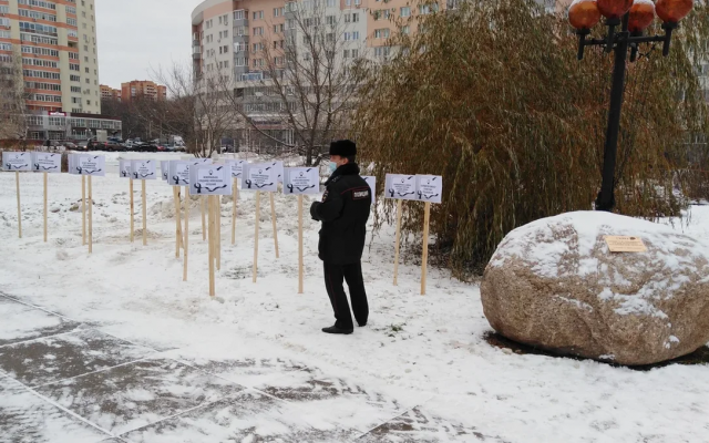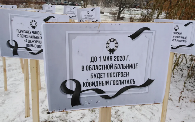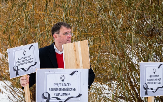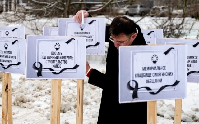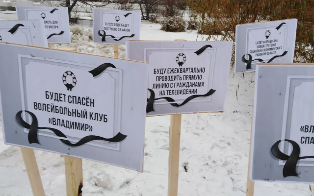 Для иллюстрации двухлетнего правления члена ЛДПР, губернатора Владимира Сипягина, были выставлены таблички "мемориального кладбища сипягинских обещаний": "Будет возрожден Владимирский тракторный завод", "Выжгу коррупцию каленым железом", "Будет спасен волейбольный клуб "Владимир", "В 2020 году будет построено 38 ФАПов", "Откажусь от резиденции в Юрьевце», "Закрою область для московского мусора", "Спасу от закрытия Новлянский крахмало-паточный завод" и другие.